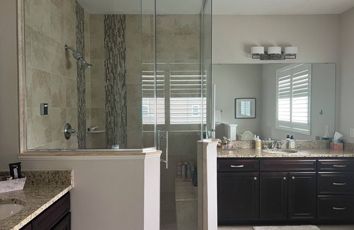 The sizable primary bedroom includes a comfy king size bed, a television, and an ensuite tiled bathroom with two separate sinks and a steam shower.