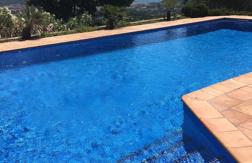 The villa is newly built in a way that all rooms profit from the natural breeze which leaves the house cool during those hot Spanish summers. There are 4 en suite double bedrooms, a large cozy living dining room with open, well stocked kitchen so the whole family or group can be together while you prepare your meals. There are several private sitting areas around the house if you prefer some privacy and the view from the comfortable loungeset has a breathtaking view over the green hills and beautiful sea and bay view.