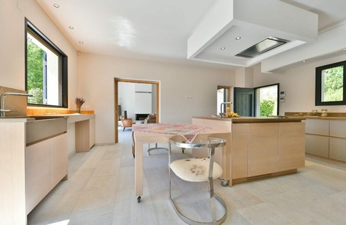 All on one level (except a bedroom and bathroom on the second floor), the house opens on both sides of the garden that surrounds it. The large living room with fireplace (35 m²), opens by three French windows on the garden and terrace to the South. In a raw, the kitchen (30 m²) fully equipped and performed by an upscale designer, offers a multitude of appliances, stone worktops and carefully organized storage. Then, a corridor distributes the main suite of the property which offers a beautiful triple exposure bedroom with a bathroom (walk-in shower, basin and toilet). On the other side of the corridor, a second bedroom with bathroom. Guest toilet.