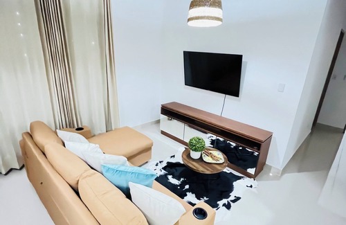 Perfect for your family in Santiago de los Caballeros. Located just 5 minutes from Cibao Airport and 10 minutes from HOMS, this apartment offers a washer and dryer, a fully equipped kitchen, internet, TV, and minimalist decor that will bring you peace. Enjoy the swimming pool, green areas, playgrounds, and tennis and basketball courts. Supermarket delivery available, Here's the translation: