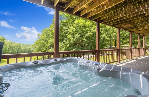 Journey downstairs to the entertainment area equipped with Billiards, a foosball table, and a huge smart TV! This level offers 3 additional bedrooms -- one designed with kids and teens in mind! They will be ecstatic about custom-built bunks offering four twin beds! *Two additional trundle beds can be made available at an additional charge. You will find two incredibly spacious bathrooms, one with a custom tiled shower. The lower-level deck runs the length of the cabin and offers a private hot tub to soak in and a private grill while you take in the views of the Ozarks!