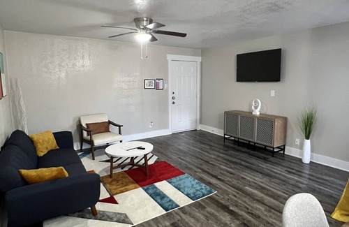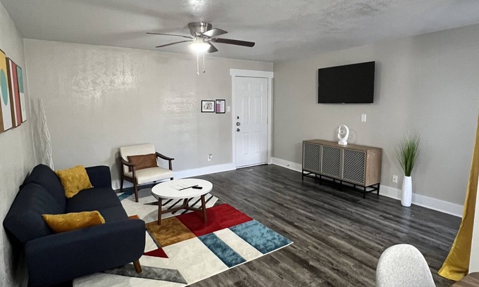 This luxurious apartment offers a centralized, cozy and secure space, located in a renovated new complex that exemplifies luxury living. Walk into a spacious living room area that flows into the dining room and a beautiful kitchen. There are 2 bedrooms one with a queen size and the other bedroom has 2 full-size beds. We also have an air mattress that is located in the closet. There are 2 nice size bathrooms at your disposal. The backyard has a seating area to go and get down time if needed.