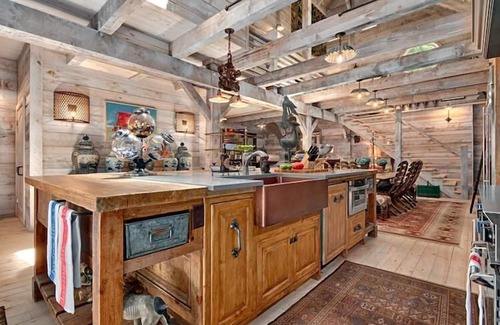 The great room with living/dining area and large open kitchen can accommodate all throughout your stay while you enjoy meals together, featuring top-of-the-line appliances, a six-burner gas Blue Star stove with griddle, a glass-front refrigerator/freezer, a Bosch dishwasher, a copper farm sink, and a fully appointed kitchen. A wall of glass sliding doors leads out to the screened-in pavilion with an 80” flat-panel TV, a wood-burning fireplace (wood provided), heaters, seating for all, and a large dining table. This is where you'll spend all your time! So cancel your dinner reservations and settle in.