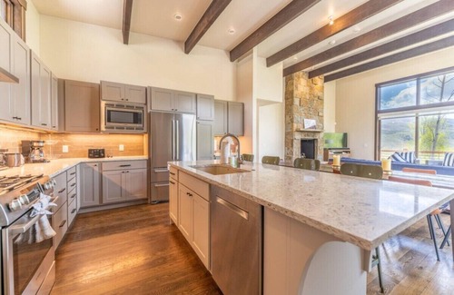 The main level includes stunning views out of every window with a spacious open floor-plan, vaulted ceilings, and a floor-to-ceiling stone fireplace. The full-sized gourmet kitchen is designed for creating delicious meals and memories. It is fully stocked with all the cookware and tableware you need and features quartz countertops and stainless steel appliances and a wine cooler for entertaining. The dining area comfortably seats eight and there are four additional seats at the breakfast bar. Just off the dining area, you will find a large, furnished deck with a gas grill and incredible views of the Gore range.