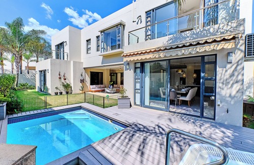 This luxurious two-storey house, situated in the quiet area of Moodie Hill, River Club in Sandton is just 2 miles from Nelson Mandela Square. It features 5 uniquely decorated air-conditioned bedrooms, each with a full en-suite bathroom. It includes continuous power, air conditioning, back-up water supply and high-speed whole home mesh Wi-Fi.