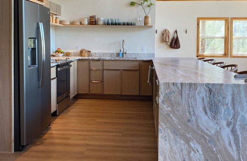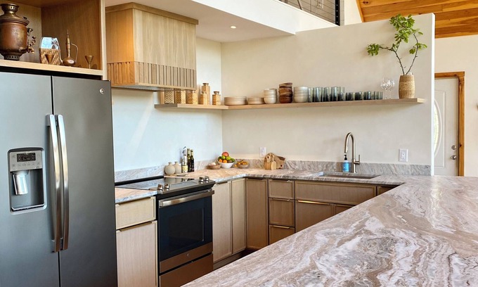 The cabin itself is 3 floors of luxury and modern design. The first floor has an open concept with a fully stocked kitchen and a waterfall island that sits 6 people. The living room & dining are all in the same space, making it a great place to entertain. The 2 story picture windows provide great Mountain Views! 2 sets of French doors take you out to the enormous deck for al fresco dining with views of the mountains, pond and valley below. Also on the first floor is a guest room with a queen bed, full bath, and laundry room. Take the stairs up and you have a huge loft with a king bed, a crib and sitting area to enjoy the 2 story window views. There is a full attached bath with an extra large walk in shower, a modern double vanity, closet space and full length mirror. The loft also opens up to a HUGE deck that has a sectional couch, table and chairs, hammock and a movie screen is available for set up to watch a film under the stars!!