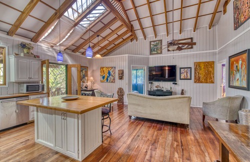 Walk upstairs and you arrive on the large covered private deck with outdoor living room, dining area and balcony styled with top quality Restoration Hardware furniture. Step inside this light and airy California style beach house to an open plan living room/ kitchen, 3 bedrooms and bathroom with a bathtub. Each bedroom has lots of light and air. Property is fully fenced.