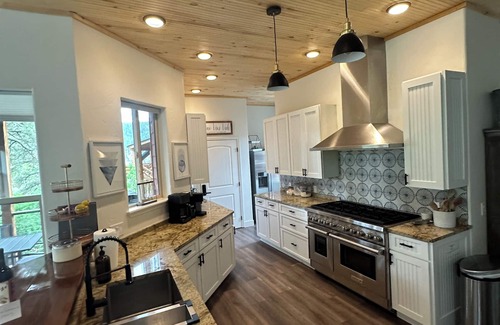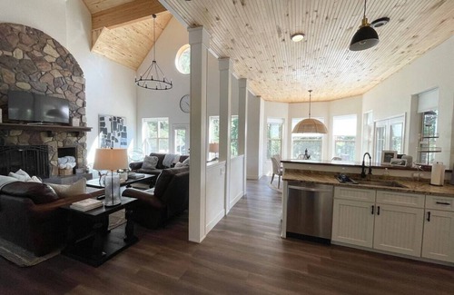 The home is a 5,000 sqf tri-level with an open floor plan and 25 foot ceilings and views of the forest from every room. It has a beautiful on-demand fireplace, is newly remodeled and refinished with new appliances, beds and bedding, bathrooms and finishes. The stunning views of the mountains and river are matched with comfortable seating throughout to enjoy the scenic beauty, relax and connect with friends and family.