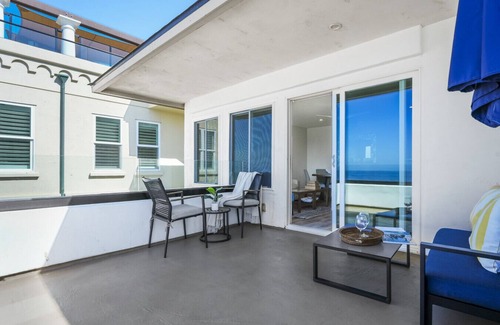 Stunning beachfront vacation rental on the sand in Downtown Carlsbad with spectacular ocean views from your balcony on our penthouse level. Full kitchen, dining room and living room with pullout sofa. The master bedroom has a king size bed. Walking distance to restaurants and shops in Carlsbad Village.