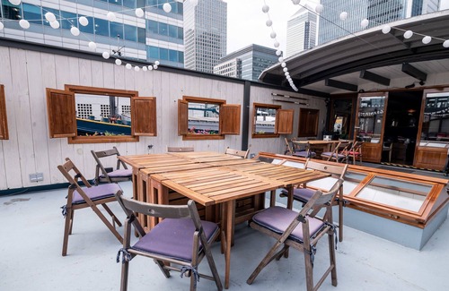 Ascend to the wheelhouse deck area for panoramic views of the Canary Wharf, a cosy spot for reading, enjoying a drink, or simply marvelling at the riverside beauty.
