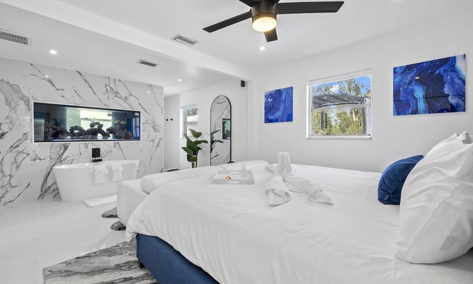 Escape to Blue Lagoon, a paradise this 4bed, 3bath luxury home features modern design, white porcelain floors, mock beach, & a standalone tub under a saltwater fish tank. Wake up to water views from your room & relax in a private oasis with pool, fire pit, and stunning sunsets Backyard has a white sand beach feel & kids enjoy the private park while adults grill in the pergola. Walking distance to shopping and dining and minutes from downtown, Book now on Airbnb for ultimate luxury and relaxation
