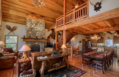 Carved plaques with antlers from Austria decorate the high walls and antlered chandeliers hang from the vaulted ceilings. The spacious Yosemite Copper Bear Lodge has cathedral-like windows for views of the forest and distant mountains. The interior space has plenty of comfortable lounge areas in plush leather furniture facing large picture windows. Small mountain creeks babble and meander by the outside decks. Rocking chairs line the deck for resting your feet and enjoying a serene evening after a long day of hiking in the high country or leisurely wandering around the valley floor. The deck also has a 4-burner Blackstone griddle for enjoying outdoor cooking. The great room has a large stone fireplace. A 42-inch flat screen television and blu-ray are available for watching a movie. The dream kitchen is fully equipped for creating your favorite meals. The dining table can seat approximately ten. The open floor plan and large dining table are ideal for spending quality family time. Phone for unlimited local calls. The decor is warm and inviting, and really encourages communal gathering. The home is surrounded by dogwoods, wild azaleas, maples, large white firs, pine, and cedar. The home has two queen beds, two twin beds, and two bunk beds (one with trundle). There is a pool table, mini arcade, game table, and board games in the loft. The loft has leather high-back chairs for reading. There are trails close to the house for hiking. In case there is a power outage in the Park, the house now has an emergency generator that will automatically start to provide power for you and your family. The lodge is perfectly situated within the park gates in a quiet cul-de-sac and away from the park crowds. From the house, you can reach the valley or Glacier Point or Mariposa Grove in about 25 - 30 minutes. You will love returning at the end of a day of hiking or other outdoor activity to this beautiful property which is tucked away inside the Park. .