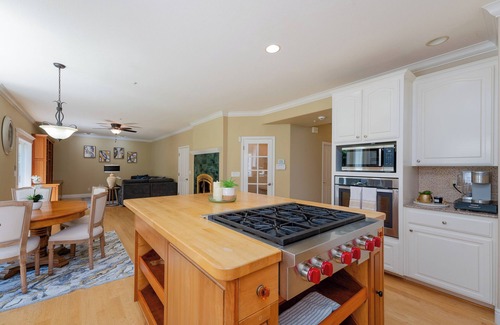 Fully equipped w/ tile countertops, large island with Wolf cooktop, refrigerator, microwave, 2 big dining table, Keurig & drip coffee maker,