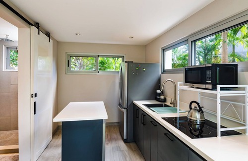 Outside, unwind on your private jungle patio, dine under the palms, or enjoy the sounds of birds and howler monkeys in the surrounding trees. The home is cooled with A/C and fans, and features modern conveniences throughout.