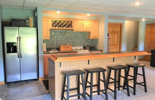 The lower level of this luxury retreat is an all purpose haven of fun and relaxation complete with wet bar including seating for four. There is a second kitchen with full size refrigerator/bar sink/range and microwave. Open seating area including queen size sleep sofa, 55" flat screen HDTV and a game room with three
