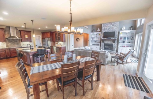 As you walk through the front door, you are greeted by the main living and expansive kitchen. As you head out the back door, you will be welcomed by a large patio, grill, firepit and lawn that is perfect for yard games. Keep an eye out for wildlife as the backyard frequently has deer, ducks, and turkeys. As you make your way upstairs you will see two bedrooms with ensuite bathrooms. Plus, will find an office area with an additional sleeper sofa couch. The third and final floor is the basement. The basement comes complete with, ping pong, pool, darts, foosball, air hockey, and shuffleboard.The large game room includes a giant 85” TV, PlayStation with a great selection of game. Gather with your friends and family to watch sports and movies seated at one of 2 pub tables or hang out and swap fish tales around the gorgeous, custom-made bourbon barrel bar. If you want to stay on top of your personal health and wellness this is the house for you. Come soak in the Hot Tub after working out in the Home Gym. Exercise equipment includes a Life Fitness elliptical machine and Life Fitness recumbent bike. You will also see an additional bedroom we like to call this bedroom the family suite as it offers a full-size crib & rocking chair plus King size bed. Located right next to a full bathroom.