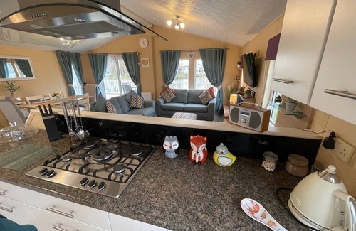 This lodge is on a large south facing plot next door to the luxury lakeside lodge L1, with a large full wrap around veranda , outside dining table and 6 chairs, large sunken hot tub with spot / fairy lights, privacy bamboo and brick bbq for your use