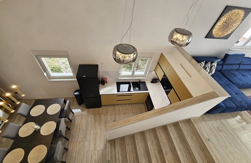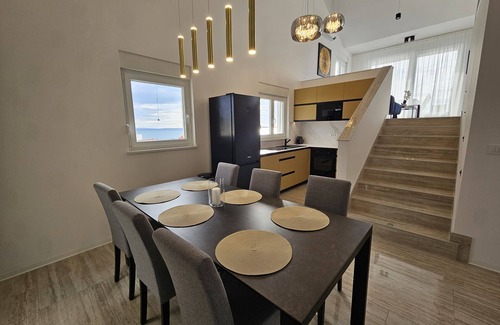 If you are looking for a modern, spacious apartment with a jacuzzi, a large terrace with a seaview in a beautiful location, this is the ideal choice for your romantic vacation or a quiet stay with the family. The loft layout offers maximum use of the open space, where comfortable seating is combined with a large dining area, a kitchen with modern appliances, a dishwasher, a microwave oven and a Nespresso coffee machine, a loggia, bar counter, living room with direct access to the terrace, outdoor dining table, deckchairs and jacuzzi. The apartment has three bedrooms, one of which is equipped with 2 single beds that can be combined into a large double bed, the second bedroom is standard with a double bed and the third bedroom is suitable for children or smaller people due to its dimensions. There is a fully equipped bathroom with a toilet, shower, sink, washing machine, hairdryer and a second toilet with a sink upstairs. The apartment has 4x air conditioning, 3x Smart TV, Wi-Fi, 2x parking spaces. Enjoy your morning coffee or evening drink on the terrace at sunset. The sea is just a few steps away...