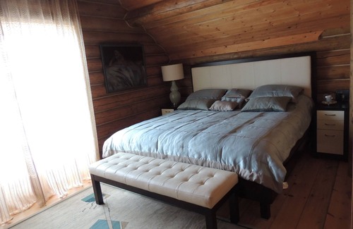 It's a new luxury two-story 3 bedroom log cottage with a cozy atmosphere. There are 2 cottages, 3 cabins, and one waterfront wood sauna on 100 acres property with 25 acres private trout lake.