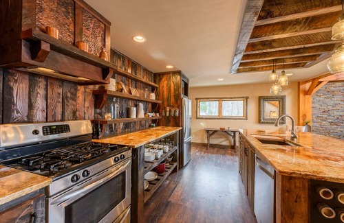 In the home, you will find furniture and finishes befitting the most discerning guest. This home gives its guests a luxury experience without the luxury cost. The kitchen is impressive with a central island with bar stool seating under a coffered ceiling made of reclaimed wood, custom-reclaimed barn-wood shelving and cabinets, hammered copper accents above the gas cooktop, granite countertops, stainless appliances, and more. The kitchen is open to the great room with comfy furniture centered around the wood-burning wood stove. Past the great room furniture is the dining area with a gorgeous cedar live-edge banquet-style dining table with bench seating and a custom-rustic bar that matches the custom rustic chandelier, all situated in front of big view windows. Dine eight (8) comfortably at the dining table, plus two (2) more at the kitchen island. Adjacent to the great room and dining area is a cozy screened-in porch with comfy furniture which looks out at mountain views. There is a stainless gas grill on a small side stoop off of the screened porch. On the main level is a queen bedroom with mountain views, a bunk bedroom with a full bottom bed, a perpendicular twin top bed with a built-in ladder, and a desk and chair. The central custom full bathroom boasts timeless character, featuring a free-standing footed soaking tub with a handheld shower wand, wood floors, beadboard wainscot, and a reclaimed beam vanity with a large rectangular ceramic vessel sink.