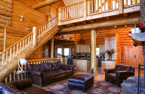 7-bathroom luxury log cabin that can accommodate very comfortably 8 adults in 4 private bedrooms plus up to 8 kids in a spacious Bunk Bed Loft. In addition, there is a Queen size bed in a private Fireplace Suite, a futon in a Game Room, and a twin-size foldout chair in two bedrooms that can accommodate additional guests if needed.