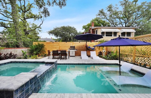 Luxury San Marco Oasis! Enjoy a private resort-style stay in this 4BR, 3BA property featuring a heated pool, hot tub, grill patio, and two fully furnished homes—a 3BR main house and a 1BR guest suite with office. Perfect for families or groups wanting space and privacy. Walk to San Marco’s cafes and shops or relax poolside in style. Pet-friendly, high-speed WiFi, and in-unit laundry included!