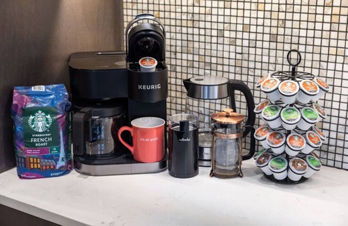 ✓ Coffee: Plenty of K-cups and ground coffee, Keurig, pot, and French Press