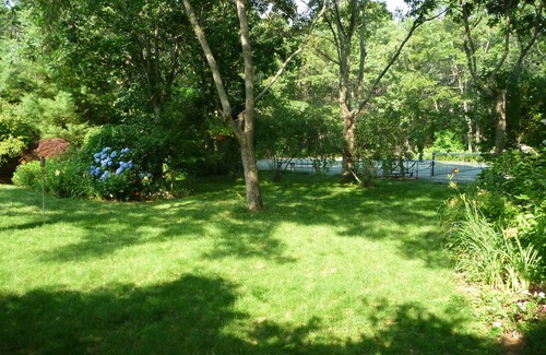 Contemporary house on 2.5 private acres in wooded setting with Heated Pool and private US Open quality DecoTurf Tennis Court. Cathedral ceilings, light rooms with sliding doors to extensive mahogany decking. Landscaped gardens. Child-friendly and Pet-friendly (fenced half-acre garden). Large Dining Room. Beautiful Sunroom. Many comfortable seating areas. Great for entertaining. 1 car garage. Finished basement and rec room with Table-tennis. High-speed Wi-Fi. 65" OLED TV with Dolby Atmos. Each bedroom has its own air-conditioner. 14.7kw photovoltaic solar system helps with electrical bills and backup battery in case of power outs. Pool heated by two systems. Outdoor shower. Close to village, close to beaches. 2 Bedrooms upstairs (queen, two twins) share a bathroom. 3 bedrooms downstairs (double, double, two twins) each have their own bathrooms.
