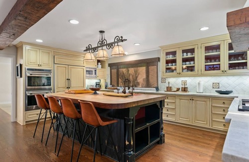 No details were missed in the farmhouse kitchen, great for larger groups or families. A chef's dream with double Wolf ovens, Wolf 4 burner gas cook top with griddle, SubZero refrigerator, KitchenAid dishwasher, and freezer/refrigerator drawers. There is seating for 20 between our two large dining rooms. The kitchen is fully equipped with all kitchen utensils and gadgets you will need to cook meals for your friends and family!