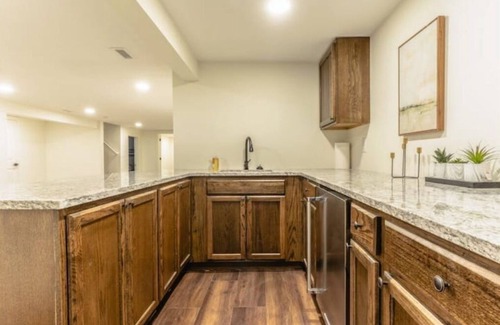 This stylish place to stay is perfect for groups or families. With multiple living spaces, our newly renovated home has room to spread out for fun or work and is equipped with 1Gb Wifi. Only MINUTES from Overland Park Convention Center, shopping center, and highway access to get anywhere quickly. Modern updates all throughout, plush beds with luxurious linens, fully stocked kitchen with laundry. A bar in the basement along with an air hockey table gives this place tons of fun entertainment.