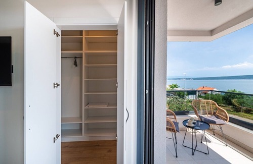 On the upper floor, the villa features four spacious bedrooms with king-size beds (180x200 cm), each with its own en-suite bathroom equipped with a modern shower. All rooms offer spectacular views of the crystal-clear sea and the charming village of Posedarje. A balcony with cozy seating invites you to relax with your morning coffee or a favorite book.