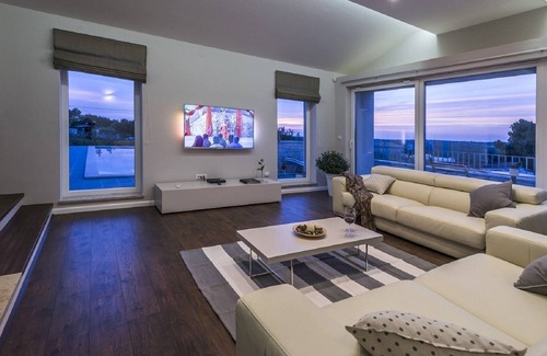 Luxury villa with infinity swimming pool, outdoor jacuzzi and garden. Villa for 8 people that consists of three floors with a total area of 400 m2. The whole house is very spacious and furnished in a modern style. The house was built in 2014. Villa Meli is located on a small hill with a beautiful view of the fields, woods, the sea and the vineyards. In front of the house is a swimming pool of 50m2 and a garden with furniture, deckchairs and an open fireplace for grilling. Free Wi-Fi is available. In the basement is a garage for 2 cars, billiards and a storage. Ground floor consists of a spacious living room with satellite TV, DVD, fireplace, kitchen with dining room, laundry room, one bedroom with double bed, private bathroom and terrace. On the first floor there are 3 bedrooms with bathroom and a balcony with a beautiful view. Three bedrooms are with double bed and one with two single beds.