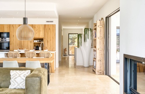 Beautiful, modern air-conditioned villa with breathtaking views of the artists' village of La Garde-Freinet. The villa is built with all contemporary comforts. From every room you experience the picturesque surroundings. The windows have electric translucent screens. The beautiful garden has a heated infinity pool with luxury sun beds, a luxurious lounge area and dining area. The summer kitchen is an extra hotspot where you can enjoy the setting sun together in the evening