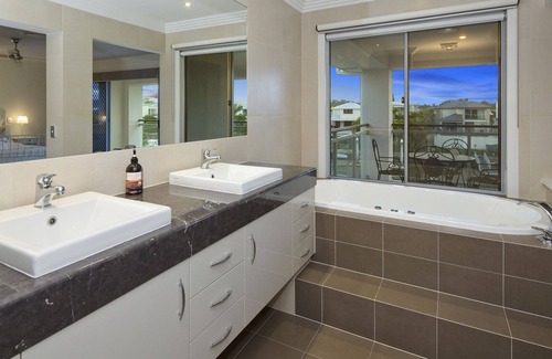 * Two bedrooms downstairs with one queen size bed each. The spacious main bedroom located upstairs, has superb waterfront and hinterland views, dream en-suite and a generous sized walk in robe as well as a very large balcony. The other two bedrooms upstairs both with one double and one single bed.