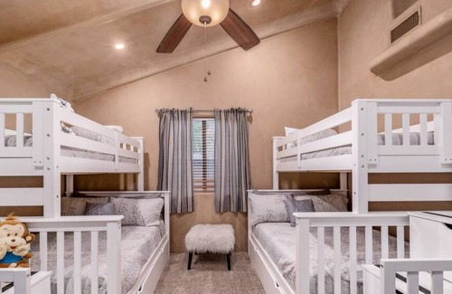 Welcome to our breathtaking, private escape, Embrace the blissful ambiance of this Glendale lifestyle residence, showcasing a modern vibe, and a mesmerizing, resort-style backyard. Spend the day golfing, hiking, or catching a game at State Farm or Camelback Stadiums, and return for a relaxing swim in the heated, sparkling pool. Fire up the grill and serve up dinner under the patio! Challenge friends to a game of golf on the pristine, pro putting green, or play a game of basketball or ping pong! The entertainment options are endless! This astonishing home is the perfect retreat for luxurious family gatherings, business retreats, golf trips, bachelor/ette celebrations, or just a relaxing getaway. In the one-of-a-kind backyard, enjoy the resort-like setting complete with a heated pool (+$200/night-please be sure to request and pay at least one week before arrival), a built-in waterslide with fire feature, spa, putting green, swim-up bar and kitchen, basketball court, playset, putting green, and more. The home itself is two houses for the price of one, has 6 bedrooms, 4 baths with thoughtful design touches throughout. Main House-Primary Bedroom: King Bed 1 king, 1 day and 1 trundle (3 beds)| Bedroom 2: King Bed | Bedroom 3: 1 bunk bed with 2 twins and 1 full (3 beds) | Bedroom 4: Bunk bed [lower bed Full, top bed Twin] (4 beds)Casita House- Bedroom 1- Queen/Bedroom 2 Bunk bed twin over full (2 beds) Full size Sleeper Sofa