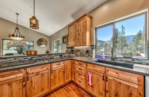 Spectacular brand new home, ready for the summer!. This fantastic new home is a large four-bedroom ideally located close to the national forest land and has lovely views of Echo Peak and nightly sunsets. Children up to 5 years of age don't count as occupancy limit! The home features a rustic Tahoe feel with nice modern touches. Acacia hardwood floors and steel gray leather granite in the kitchen. Upgraded Kitchen Aid stainless steel appliances. Etched metal chandeliers and pendants. Natural Knotty Alder cabinets, doors, base, and case throughout. Etched mountain mirrors in the bathrooms. There is a jetted tub in the master King bedroom, two queen bedrooms on the bottom floor, and a lovely pullout couch.