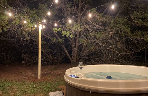 Enjoy a quiet retreat whether you are looking for a romantic getaway for two, Honeymoon or a relaxing girl’s weekend. Relax with a glass of wine on the large front porch watching the deer nearby in the two chairs or on the comfy daybed. Or after a long day of shopping and vising the local wineries wind down in the hot tub off the back porch while secluded for privacy in the nature of the Hill Country.