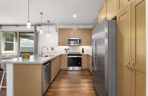 The living room leads seamlessly to a gourmet kitchen equipped with modern appliances, barstool seating, and everything you need to make at-home meals and snacks a breeze. Gather around the dining table, illuminated by the sun streaming through large sliding doors, to spend time chatting, eating, or playing games.