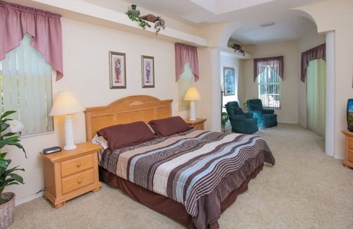 This lovely villa is located minutes from the Gulf of Mexico. Enjoy your stay in this four bedroom home with two sitting areas, for those who like to read while others enjoy some t.v. Entering the home to the left is the master bedroom with king size bed and en-suite bathroom. Large walk in shower and spa tub complete this bath.