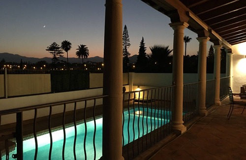 Detached villa with private parking and swimming pool, with espectacular views to the mountains. In Marbella between the beach and the town of de San Pedro de Alcantara. A 5 min walk to the beach or to the town by the boulevard. A very quiet neighborhood very close also to Guadalmina Royal Country Golf Club. Swimming pool with 8 hammocks and sun all they long. It has high speed wifi, televisión, air conditioner, laundry, pingpong table, pool table, and soccer table. Puertos Banus is at 40 min walk or 5 min by car.