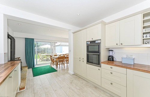 The central hall has a double-height ceiling looking up towards the first floor sitting room (open fire not in use). Sliding doors open into the games room with full-size pool table (50p per game) for rainy days and evening fun! The games room is open plan into the dining room and kitchen, looking out over the garden through wide doors. The dining table sits next to an ornamental log burner (not in use), and the kitchen is fully equipped including an espresso machine and a small utility room to the side. Stairs from the entrance hall take you to the first floor sitting room with large Smart TV, offering glimpses of the sea barely 100 metres away.