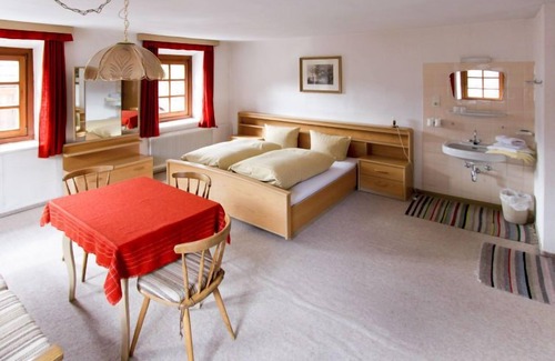 "Matt", 15-room house 380 m2 on 3 levels. Rustic and cosy furnishings: large living/dining room with dining table. Interconnecting room with dining table. Living/dining room with dining nook, satellite TV and tiled stove. Large kitchen (oven, dishwasher, 5 ceramic glass hob hotplates, microwave, electric coffee machine) with small dining table. 3 sep. WC's. Upper floor: 2 double bedrooms, each room with hand-basin and shower. 1 double bedroom. Interconnecting room with 1 bed, hand-basin and shower. 1 room with 1 double sofabed, 1 double bed, hand-basin and shower. 1 room with 1 bed, hand-basin and shower. 2 sep. WC's. 2nd upper floor: 1 room with 1 bed, hand-basin and shower. 2 double bedrooms, each room with hand-basin and shower. 2 rooms, each room with 1 double sofabed, 1 double bed, hand-basin and shower. 1 room with 1 bed and hand-basin. Shower/WC, sep. WC. Heating. Parquet floors, carpet. The living room is a farmhouse lounge. Box-room. Facilities: children's high chair, baby cot for up to 2 year olds. Internet (WiFi, free). Please note: non-smokers only. Smoke alarm. When there are less than the maximum number of guests staying at the property, not all of the housing units will be available for use.