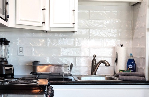 Kitchenette is stocked with a new (2025) Insignia fridge, microwave, both ceramic and plastic dishes, cutlery, blender, toaster, pots and pans, storage containers, insulated mugs, kettle, Keurig coffee maker, starter set of coffee and creamer pods as well as packages of crystal light.