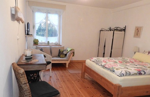 Welcome to the rural holiday on the Rossenhof Four guest rooms, each with its own bathroom, and a communal kitchen developed in 2013 on our farm. Everything is barrier-free, a room is also wheelchair accessible. We can rent each of the four rooms individually, there are three double rooms and one twin room, two of the rooms are also very suitable for single travelers. There is also the possibility to rent the whole apartment. We offer breakfast, in the communal kitchen you can also cook yourself. On some days we organize communal cooking days, mostly with regional dishes. A stove witch in the living area provides a cozy atmosphere. Our farm is in a secluded location, very quiet in the midst of fields and meadows. A small forest and many hedges surround it protectively. You can relax here, start cycling and walking tours, take trips to Flensburg and many other interesting places and reach the North and Baltic Sea quickly. You have numerous opportunities to be active and creative here on the farm. Throughout the year and often independent of the weather our theme days, which deal with the country life, take place. Our large plant hall and a workshop make this possible. Pets are bookable for 5 € / day.