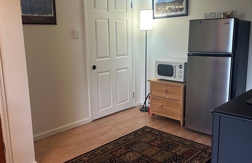 Inside, you'll find a welcoming bedroom furnished with a plush queen-sized bed and a smart TV equipped for streaming, perfect for relaxing after a day of exploration. The suite features a kitchenette with a double electric hot plate, electric griddle, toaster, electric skillet, refrigerator, microwave, and coffee maker — making it easy to prepare your favorite meals. The full bathroom boasts a walk-in shower, adding to the suite's comfort and convenience.