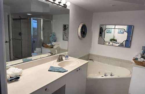 You will enjoy the large bathroom with a jacuzzi bathtub , separate shower , separate toilet , adjoined to the bedroom with a king size bed.
