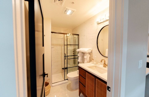 Our stunning 3-bedroom mezzanine loft in the historic Keystone Building combines modern luxury with charming vintage appeal.