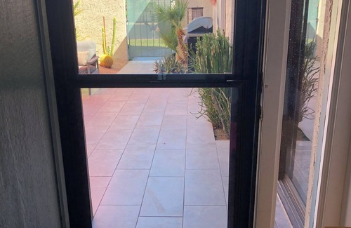 City of Palm Springs Registration Certificate #2691. Relax and unwind in our fully remodeled vacation condo in central Palm Springs, at Sunrise Racquet Club. Our home is modern, hip and private, in a very safe, gated community that features 40 acres of lush green lawns, walking trails, palm trees, 4 tennis and 4 pickle ball courts (3 lit at night) and and indoor racquetball court. A short walk outside our door, you’ll find a saline, heated pool (one of 6 in the complex) and large hot tub, with comfortable lounge chairs poolside. Our condo was totally renovated from top to bottom and sports polished concrete floors, a new kitchen with stainless steel appliances and quartz countertops. The décor and furnishings blend mid-century modern style with 21st century comfort. Outfitted with flat screen TVs, cable, wi-fi internet access, ours condo is an ideal vacation rental in the desert. We have a private, east-facing courtyard patio for you to enjoy your morning coffee; there are breathtaking mountain views from the southwest patio and a BBQ for grilling. Adjacent to the fully stocked kitchen, our dining area seats 6, with bar seating for 3. The living room, with its magnificent vaulted ceiling, is equipped with a 60”flat screen TV, DVR, many HD cable channels and a Bose stereo with iPod docking. The master bedroom has a 37” flat screen TV, king-sized bed, direct access to the southwest patio and a walk-in shower with glass wall and marble floor. The second/guest bedroom has a queen-sized bed, built-in desk/office space and sliding glass door to the east-facing patio. A second bathroom is nearby, with a shower and bathtub. There is a washer and dryer in the suite, as well as abundant linens and towels. Our home is conveniently located 5 minutes from downtown shops and restaurants, golf courses, Palm Springs Art Museum, mid-century design district and funky coffee shops. Activities in the Palm Springs area include many more golf courses, hiking, horseback riding, Joshua Tree National Park, a water theme park, an aerial tram and shopping on El Paseo Drive in Palm Dessert and at the designer outlet mall, in Cabazon. Whether you are seeking a quiet, sun-filled getaway, or an action-packed holiday, our condo as it all. Small dogs may be considered, please contact owner for fees and permissions. Guests can check in any day of the week and check out any day of the week contrary to what another section of the VRBO site says. 14 nights are a minimum stay in the Sunrise Racquet Club community. Stays more than 28 days are not required to pay the city of Palm Springs vacation tax and will be provided an 18% discount!