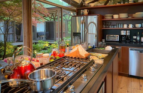 New in addition to The Glass House in 2023, is The Studio, a gorgeous space (about 16 x 16), with a wrap around deck, that is bulit over looking a stream. This Studio is accross the driveway from the main house (about 80 ft) and can be used as an additional bedroom with a queen bed or a home office space.