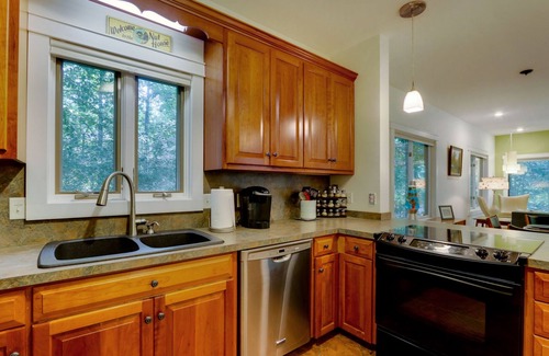 Offering a main level great room with floor to ceiling windows, gourmet kitchen, dining area, TV nook, and deck overlooking woods with babbling creek. The three bedrooms offer the following configuration: main-level, king-bedded master (1 K) and two upstairs bedrooms (1Q and 2T). Linens and towels included.